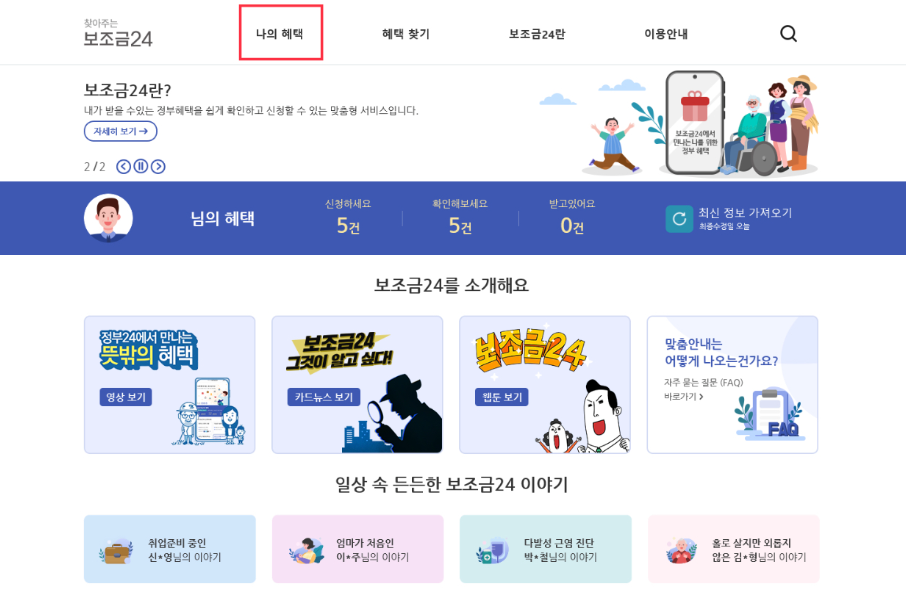 보조금 24에 들어가신 후 나의 혜택 버튼을 누르시면 자신의 현재 소득분위 주택유무, 개인특성 별 맞춤 정부지원 혜택을 한 눈에 확인하실 수 있습니다.