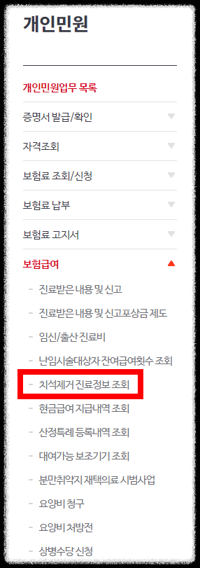 [보험급여 - 치석제거 진료정보 조회] 순서로 눌러주세요.