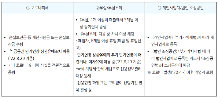 (지원제외대상) 신청자격을 맞추기 위해 고의연체한 차주, 고액자산가가 소규모 채무 감면을 위해 신청하는 경우 등에서는 채무 조정이 거절될 수 있습니다.